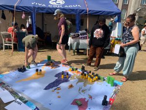 Wir veranschaulichen die abstrakten und schwer vorstellbaren Daten und Fakten, indem wir diese anhand von jeweils 20 Spielfiguren pro Themengebiet und einer großen Weltkarte stark vereinfacht in Relation setzen.